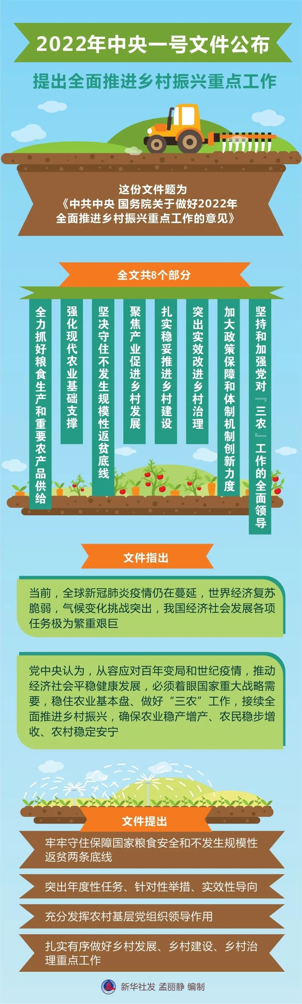 做好2022年“三農”工作,要以習近平新時代中國特色社會主義思想為指導,全面貫徹黨的十九大和十九屆歷次全會精神,深入貫徹中央經濟工作會議精神,堅持穩中求進工作總基調,立足新發展階段、貫徹新發展理念、構建新發展格局、推動高質量發展,促進共同富裕,堅持和加強黨對“三農”工作的全面領導,牢牢守住保障國家糧食安全和不發生規模性返貧兩條底線,突出年度性任務、針對性舉措、實效性導向,充分發揮農村基層黨組織領導作用,扎實有序做好鄉村發展、鄉村建設、鄉村治理重點工作,推動鄉村振興取得新進展、農業農村現代化邁出新步伐。