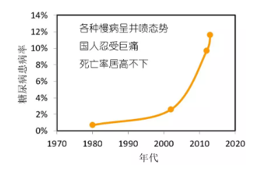 以前,快病比較多,治療也相對來說比較簡單;而現在,世界多個國家的慢性疾病發病率逐年上升。1980年,我國糖尿病發病率大概只有0.7%,平均一百個人中只有不到一人患病;而到了2013年,糖尿病的發病率已經達到了11.6%。慢性疾病也成為了人們身體內潛在的一大健康風險。